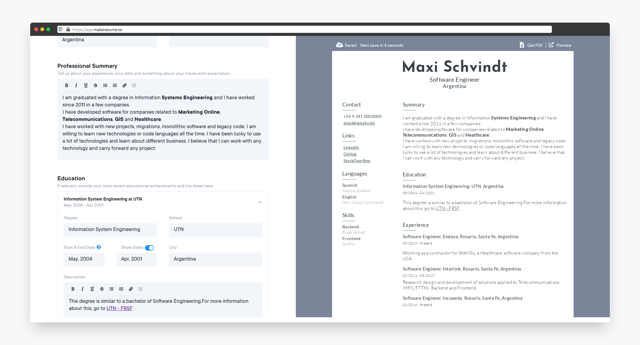 Create your resume, get your PDF, or share the link.